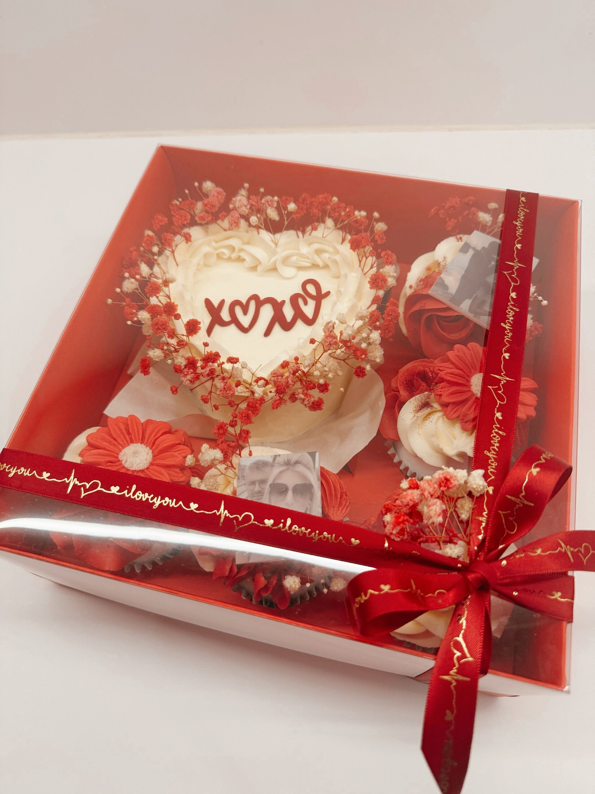 Een mooie cadeaudoos gevuld met een taartje en 5 cupcakes